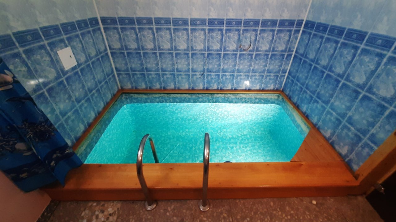 Обивка сидений в комнате отдыха содрана. Занавески на окне нет, а подтолкнула какая-то тряпка.Чёрная плесень на вытяжках, вдоль бассейна, на ведре купели. Сломано крепление душа. Отсутствует часть плитки на бордюре бассейна. Дым и угарный газ в парилке, когда подкладывают дрова.